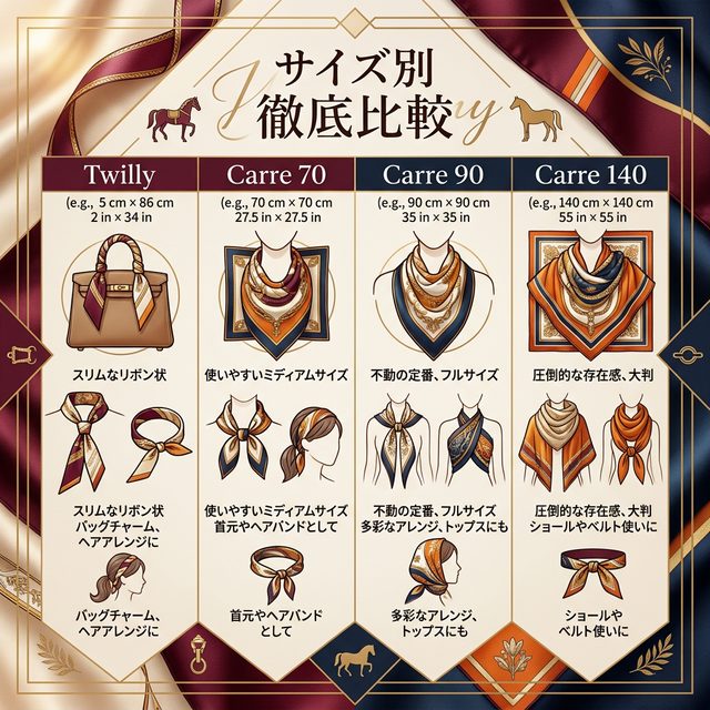 エルメスのスカーフには、用途に合わせて様々なサイズや形のバリエーション(ラインナップ)が存在します。