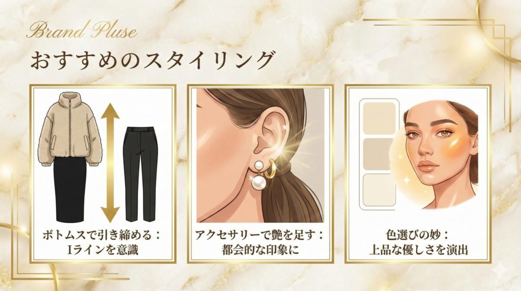 * **アクセサリーで艶を足す:** 耳元にパールやゴールドのピアスを添えるだけで、ぐっと都会的な印象になります。